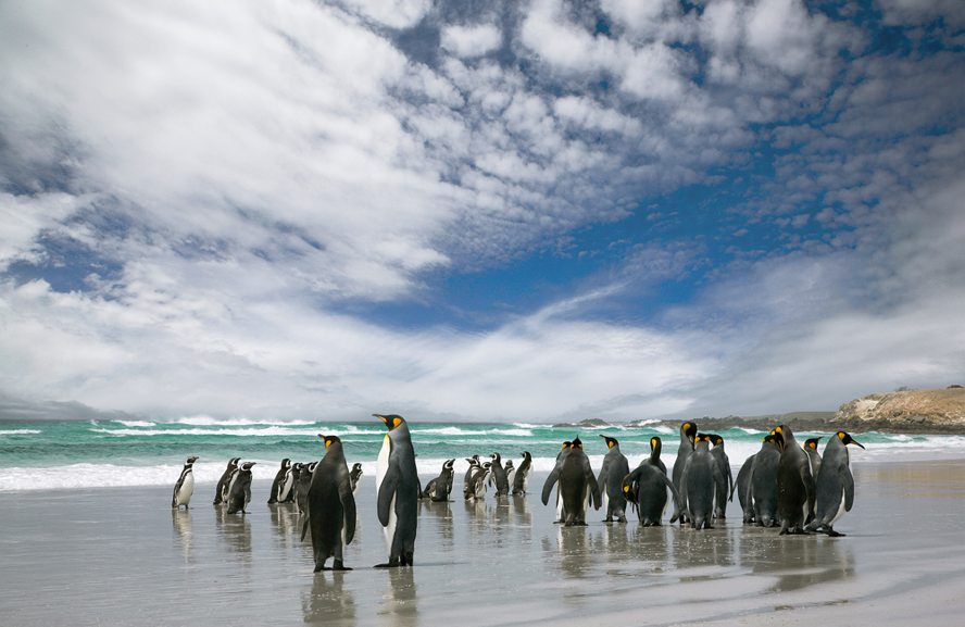After a quick porridge breakfast, pick up your packed lunch that you requested the night before. Drive east to the black-and-white Cape Pembroke Lighthouse, the easternmost point of the Falklands. Nearby Gypsy Cove is beautiful–rough seas pound a white-sand beach where Magellanic Penguins and Rock Shags make their homes–but dangerous; much of the area is fenced off due to Argentine land mines. Excited by your first penguin sightings, head north to Volunteer Point. Large King Penguins, long-tailed Gentoo Penguins, and more Magellanic Penguins breed here along the beautiful beach. It’s noisy and stinky, but you’ll walk away with unbelievable photos. Still feeling adventurous? Continue north to Cape Dolphin, a stunning, desolate area with even more penguins, sea lions, and possible whale sightings.