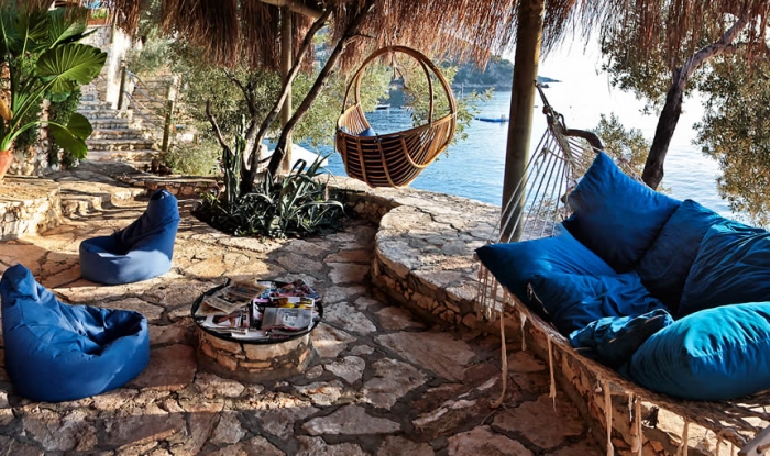 That dusty road finally brings you to Villa Mahal. The small hotel has only 13 rooms. They’re built into the hillside and positioned for drop-dead gorgeous sea and sunset views. The crescent-shaped infinity pool and the restaurant have the same view, of course. The gardens are filled with olive, fig, and lime trees. The beach club has stone terraces built into the steep cliff. And there are plenty of hammocks, oversized cushions, and loungers in which to relax. Relaxing here shouldn’t be a problem.