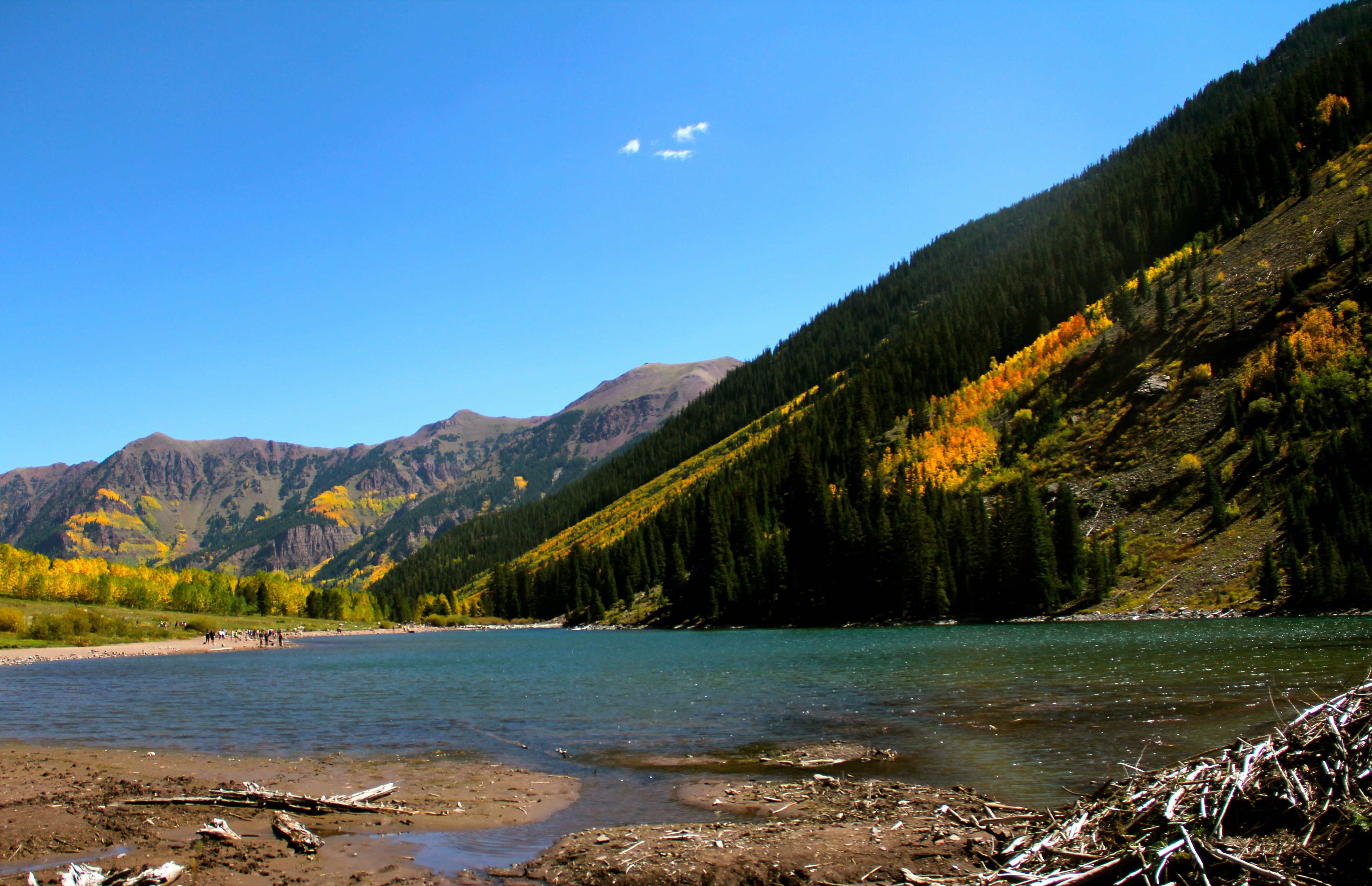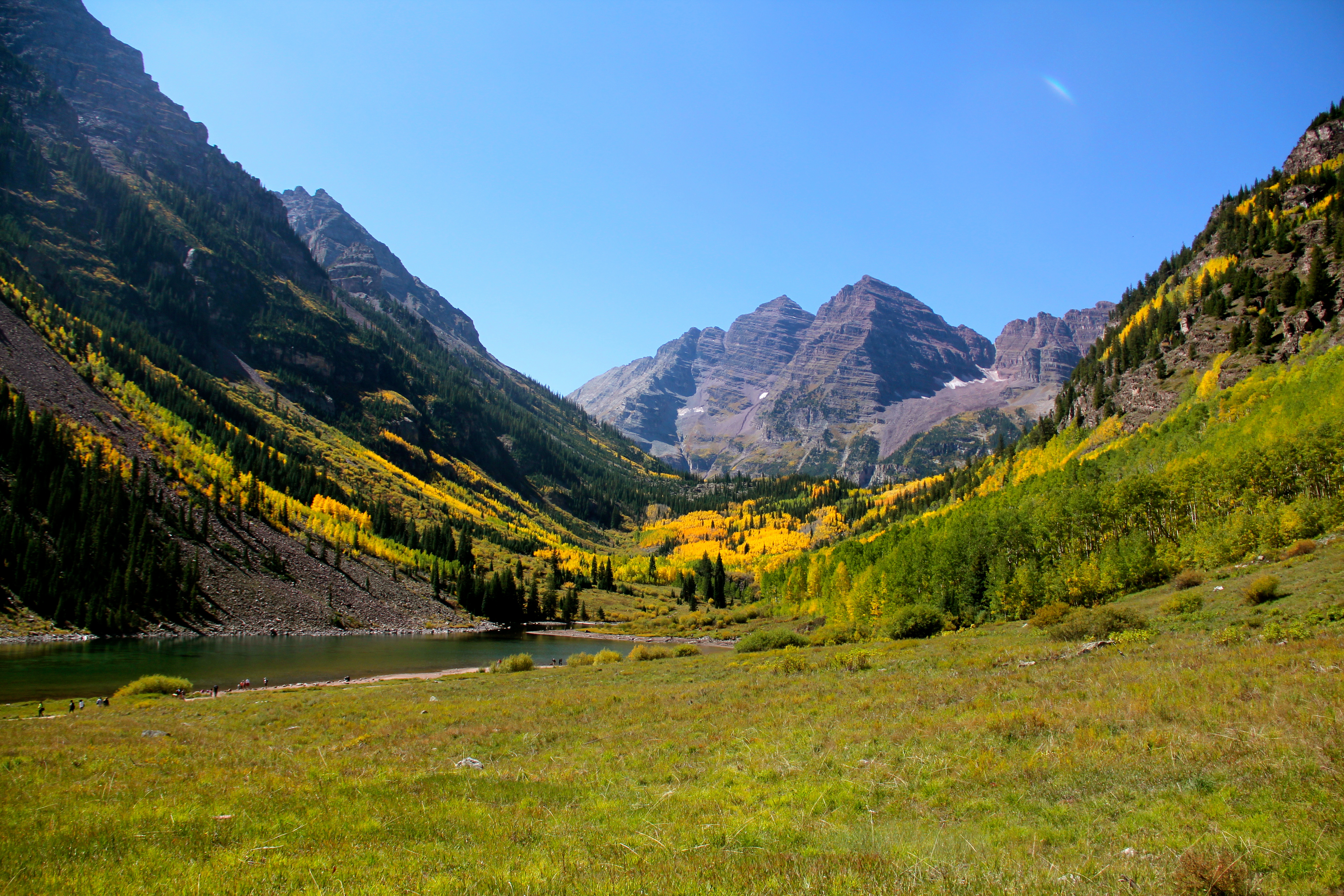 You deboard and follow the path toward the mountains. Suddenly, you stop. In front of you are not only the two peaks, but also Maroon Lake. The glacial basin was formed after rock debris damned the Maroon Creek. Beavers are busy building a den. A fly fisherman is casting. And you can see the reflection of the Maroon Bells in the calm water.