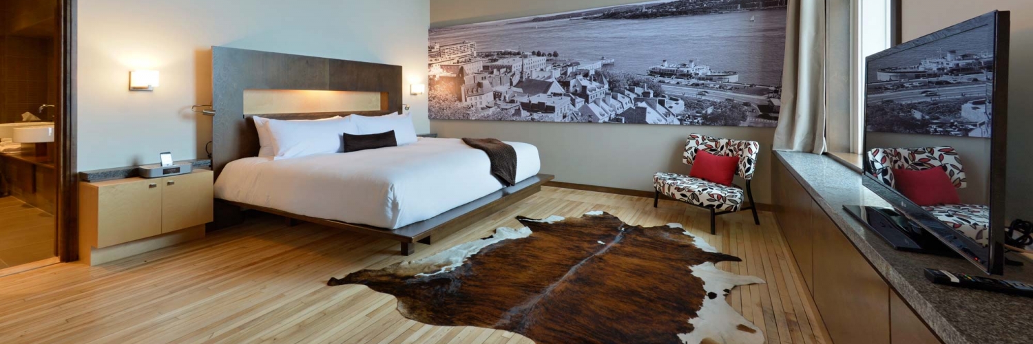 Prefer a place that feels bright and airy? Hôtel 71’s uncluttered rooms might have the most comfortable beds in Québec City. Random animal prints stand out in your room’s otherwise neutral-toned palette. The hotel is located in an old bank—it’s Neoclassical façade gives it away. Watch the sun rise from the rooftop. Grab a cup of coffee at the 24-hour Espresso Lounge. Pick up a boxed breakfast downstairs. And then ride a bike along the esplanade to the Battlefields Park and the National Museum of Fine Arts of Québec.