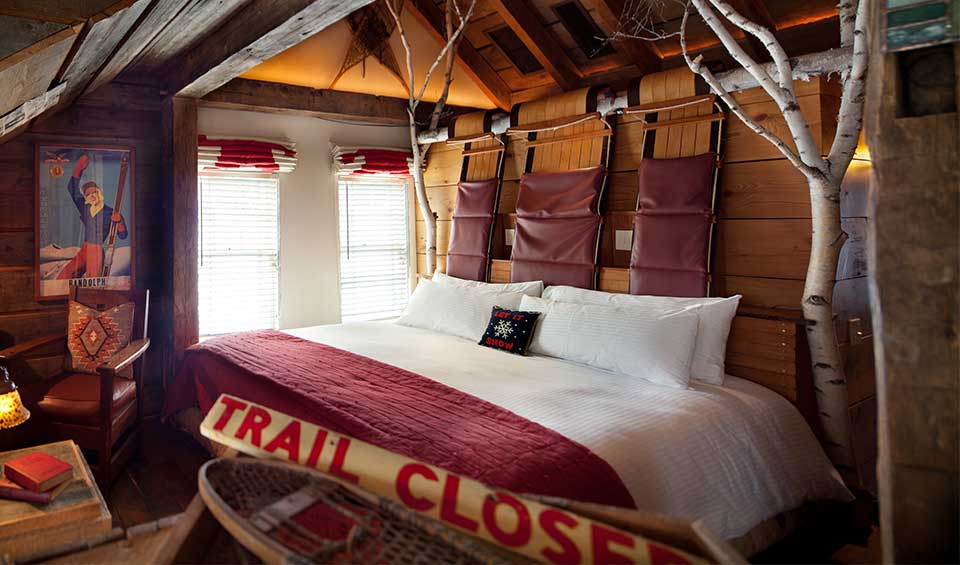 The Pitcher Inn was built in the Civil War era as a lodge for wagon drivers. When you arrive, the porch is still decorated with garland and white lights. Oil lamps from the 19th century glow at the entrance. A big fireplace crackles and hisses. While a fierce-looking taxidermied black bear stands in the lobby. Each of the inn’s eleven rooms is unique. Given your goal for the weekend, you selected the Ski Room, which looks like a ski resort’s base lodge, with a vintage ticket booth, old ski posters, and a brick-and-stone fireplace. Birch tree branches grow through the ceiling. Plus, a “Let It Snow” pillow sits on the bed. You can’t wait to hit the slopes in the morning.