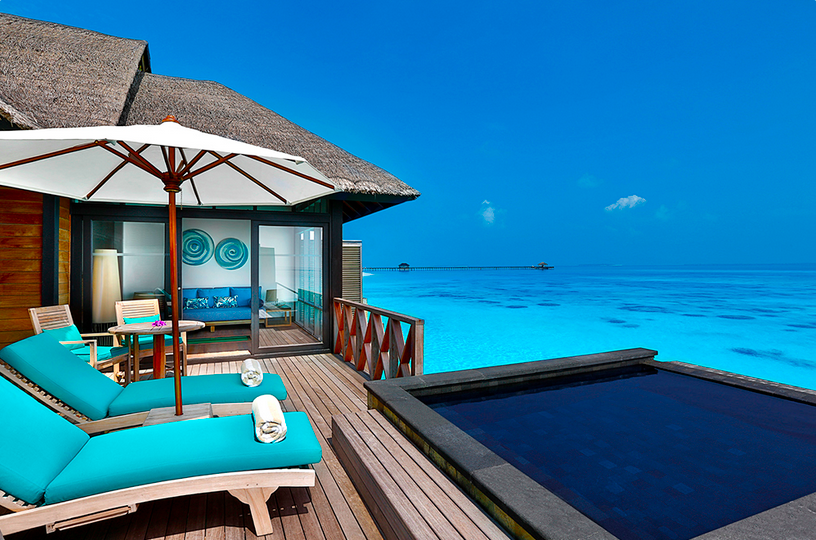 The resort is the perfect place to celebrate—and relax. Slowly walk down the jetty as your eyes dart every which way to take in your beautiful surroundings. Try to pay attention while checking in, but find it much too difficult with the splendid beach within eyesight. Nod your head with approval as you pass restaurants, pools, and the spa en route to your villa. Get excited when you see the thatched roof, the floor-to-ceiling windows, and the floor’s glass panel in your sunrise water villa. Then fall in love for a second time when you step out onto your deck. Two sun loungers, an infinity plunge pool, and the uninterrupted Indian Ocean are in front of you. This truly is paradise.