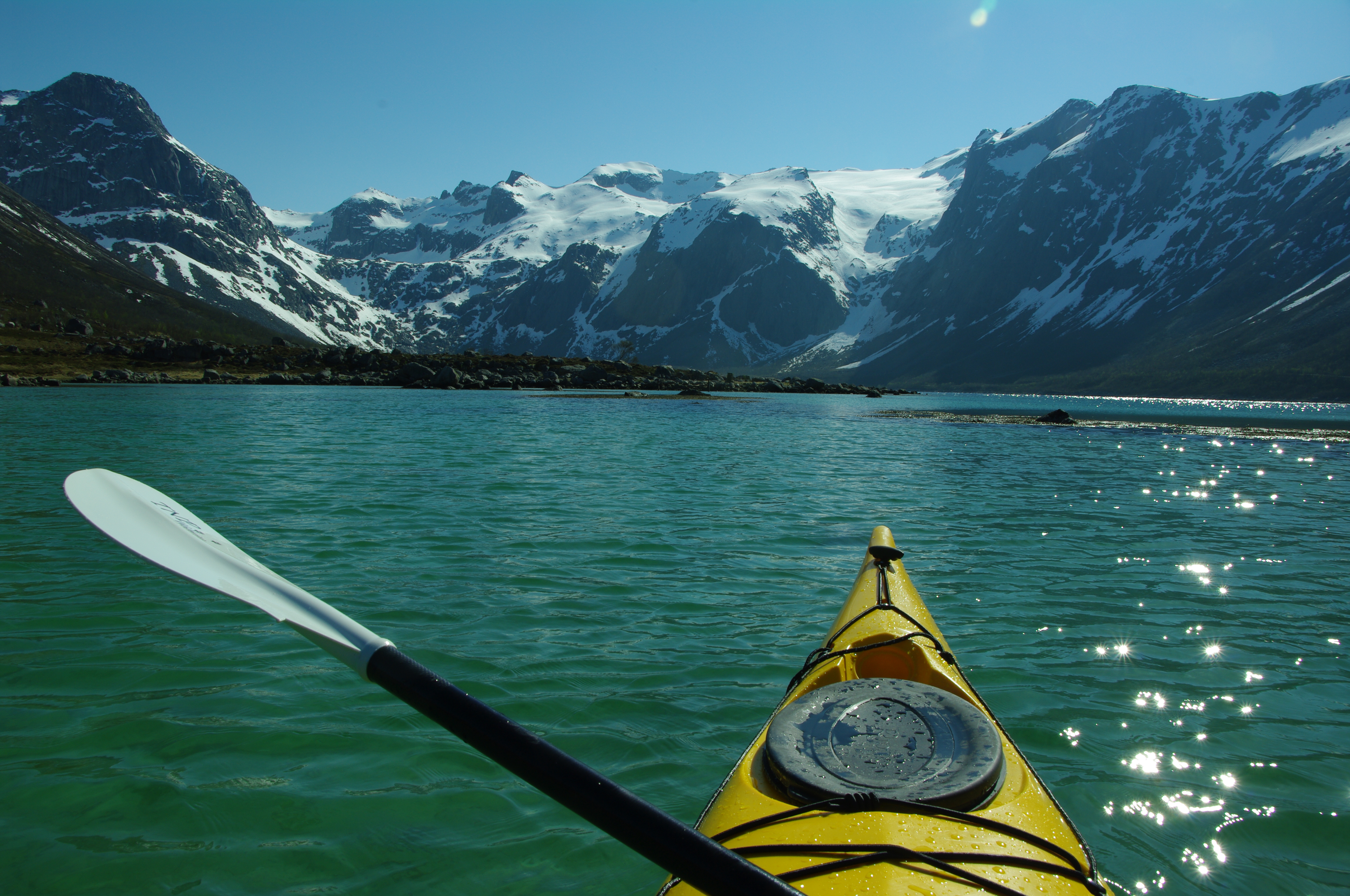 Wiggle into a protective suit, complete with booties and gloves, that will save your life if you fall into the frigid water. Get the feel for the sea kayak, which is longer and narrower than the kayaks you’ve used on lakes. Paddle around fjords, mountains, and small waterfront villages. Look for eagles in the sky and whales in the water. And stop at a golden-sand beach for a break and a hot drink. Despite waking up incredibly early this morning, you’re still full of energy out in the kayak. The sun isn’t the only thing that refuses to settle down above the Arctic Circle right now.