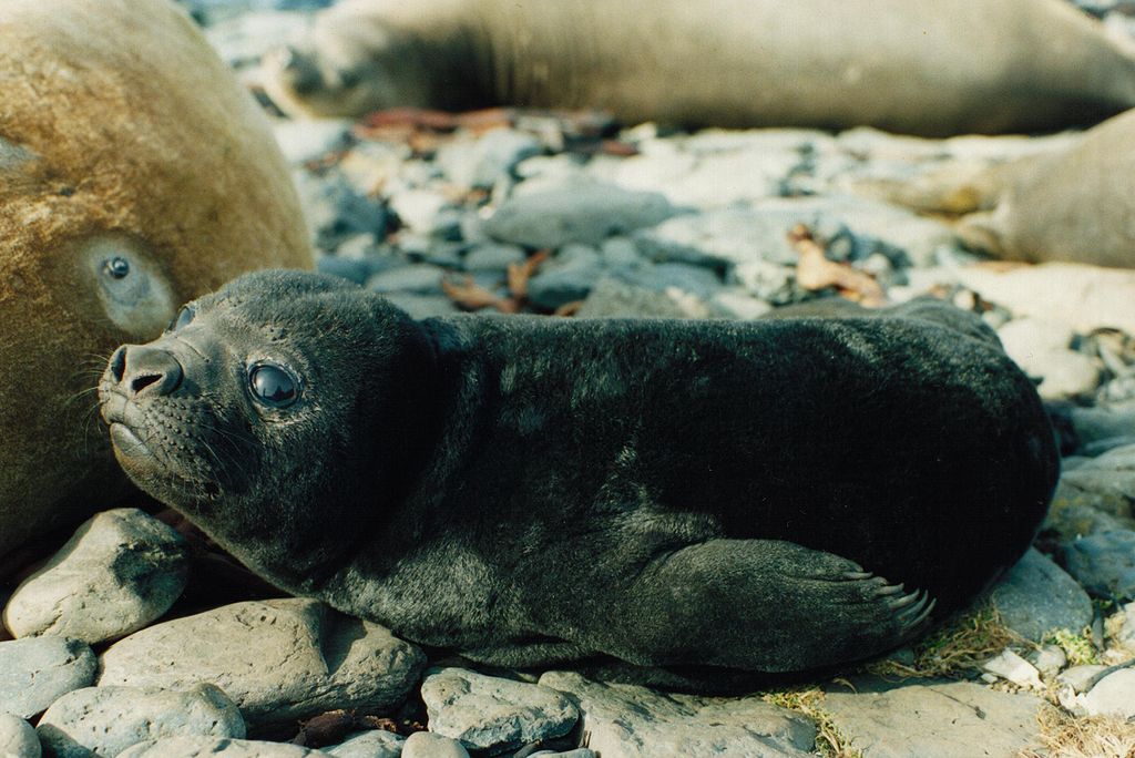 As you round a treeless bend, you see that the noisemaker is a southern elephant seal. Make that hundreds, if not thousands, of southern elephant seals. The bulls—the largest of the seals—are enormous. They must weigh 6,000 pounds, if not more. They have large black eyes, a trunk-like snout, a tail fin, and webbed feet, while their thick skin looks like leather. Furry black pups stay close to their mothers. Plus yellow-crested macaroni and long-tailed gentoo penguins huddle in the background.