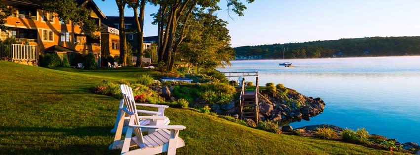 Your selection: Church Landing at Mill Falls. The rustic inn sits right on the lake. White Adirondack chairs litter the lawn. Wooden steps lead down to a little beach. While the once-green gardens now display all of fall’s jewel-toned colors. Inside, your room has down bedding, a fireplace, and a balcony. You’ll probably spend most of your time out there, since the canvas chairs have a perfect view of the calm water.