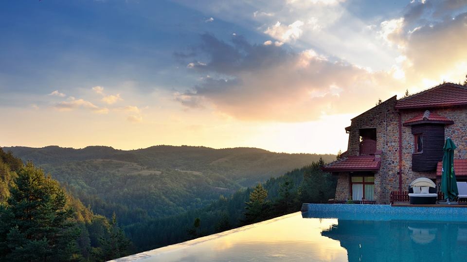 The buildings are made of volcanic rocks and have traditional, red-tiled roofs. The cozy restaurant has wooden beams and a gas fireplace, local cuisine and Macedonian wine. Wooden bridges and hammocks dot the green lawn. While that infinity pool overlooks Berovo Lake, the Maleševo Mountains, and millions of pine trees.