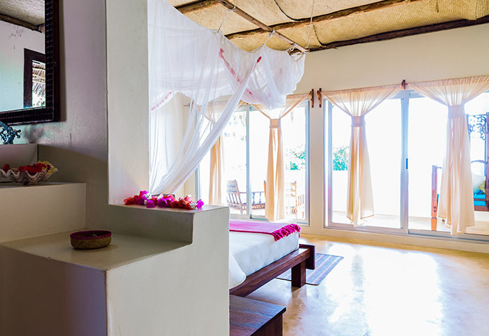 Your first stop is the beach, of course. Handwoven sun loungers and hammocks sit under palm trees on the warm, white sand. A wide wooden swing hangs in front of the sandy floored beach lounge, where handpicked mangos, pineapples, and limes are blended with a touch a rum for a refreshing drink. The two-tiered pool, in which you might finally take a scuba-diving lesson, is just steps away. Your room rate includes one treatment each day at the Kipepeo Spa—you’re thinking about starting with a Swahili head massage. Plus most meals, featuring freshly caught seafood, are served on the main veranda that overlooks the water.