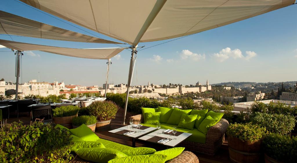 But it’s the Rooftop to which you’ll return again and again. The lounge and restaurant have rattan couches and overstuffed pillows, green plants and wide umbrellas to protect you from the sun. You barely notice any of them at first, since it also has a panoramic view of the Old City. The Walls of Jerusalem, the Jaffa Gate, and the Tower of David are all in front of you. The view is jaw dropping.