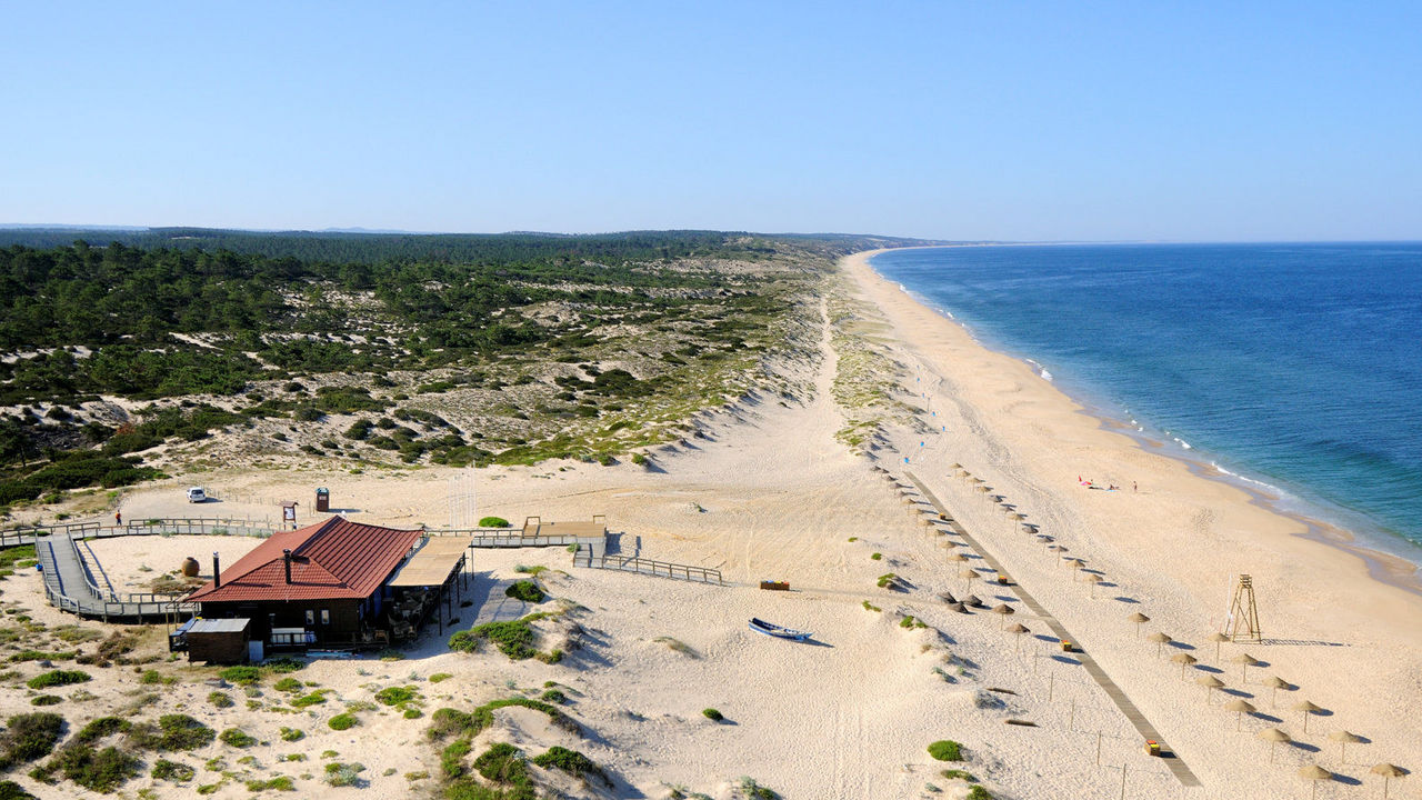 Portugal may be harder to reach than Mexico, but it’s certainly easier than Brazil and Uruguay. After an overnight flight to Lisbon, drive—or, better yet, ride the train—an hour south into Alentejo. Comporta, on the peninsula where the Atlantic Ocean meets the Sado River, is known for its extensive rice fields, wetlands, and sand dunes. But it’s famous for its endless white-sand beach.