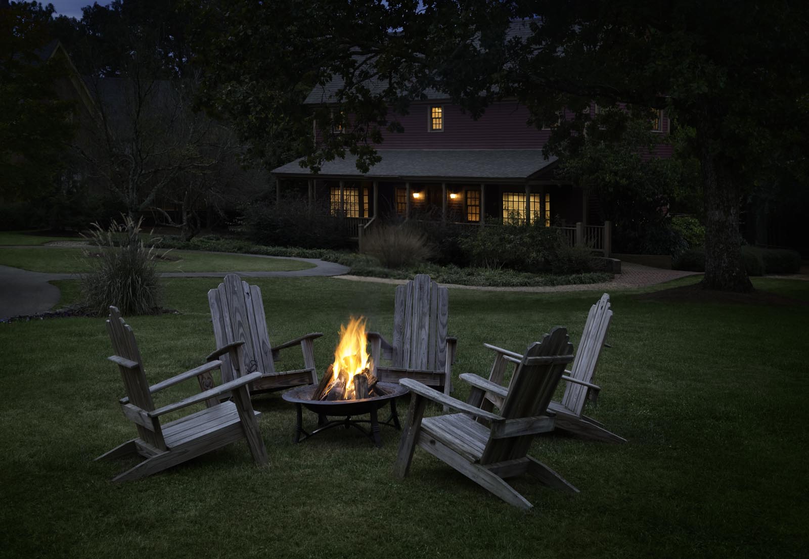 But back to those cabins. Rocking chairs and a stack of firewood sit on the veranda of your little brown one. It has hardwood floors and a comfy living room inside. There’s an armchair beside the fireplace, a sleigh bed in the bedroom, and a clawfoot tub in the bathroom. Adirondack chairs surround a fire pit outside. While, as if on cue, a flock of wild turkeys is walking across the lawn as you glance outside while unpacking.