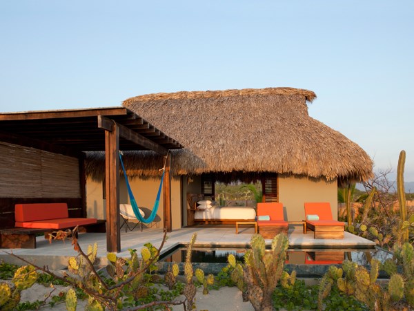 As for the hotel, it’s perfect. At Hotel Escondido, there’s no doubt that you’re in Mexico. Sandy paths lead to individual cabanas that have been constructed out of wood and palm leaves with thatched roofs. They have tropical wood floors painted with colorful geometric patterns. Orange accessories pop against the simple wood furniture. The walls slide open to reveal tall cacti and the mountains on one side. A chill-out zone—featuring sun loungers, a hammock, and a salt-water plunge pool—is on the other.