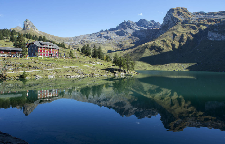 Your first destination is Eggendössli, which you reach by following the trail by Zingel Alp and Lutersee Lake, from which you might see a reflection of the area’s highest mountain, Titlis, on a clear day. Board your first cableway, whose somewhat rickety blue cars were built to transport farm goods over the steep terrain, to descend to the village of Mettlen. Follow the ice-cold Aa River to Büelen, where a cableway (this one feels a bit sturdier) climbs high into the still snow-capped peaks. It’s downhill to Diegisbalm and another cableway to Wolfenschiessen, before you meet up with the river again. That leads to the Brändlen station and, eventually, Berghof Brändlen, the hut where you’ll spend the night.