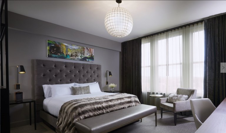 The elegance-meets-ease vibe extends upstairs, as well. Sleek gray and white tones, soft fabrics, and floor-to-ceiling windows fill your Coppin King room. There are subway tiles and a walk-in shower in the bathroom. Amenities include local goodies in the mini-fridge, “hello handsome” hangers, and tokens for free coffees at the Artisan Coffee Bar, which would have been your first stop anyway, in the morning. Then you just have to convince yourself to go explore the rest of Covington—and maybe even Cincinnati—for the rest of the day.
