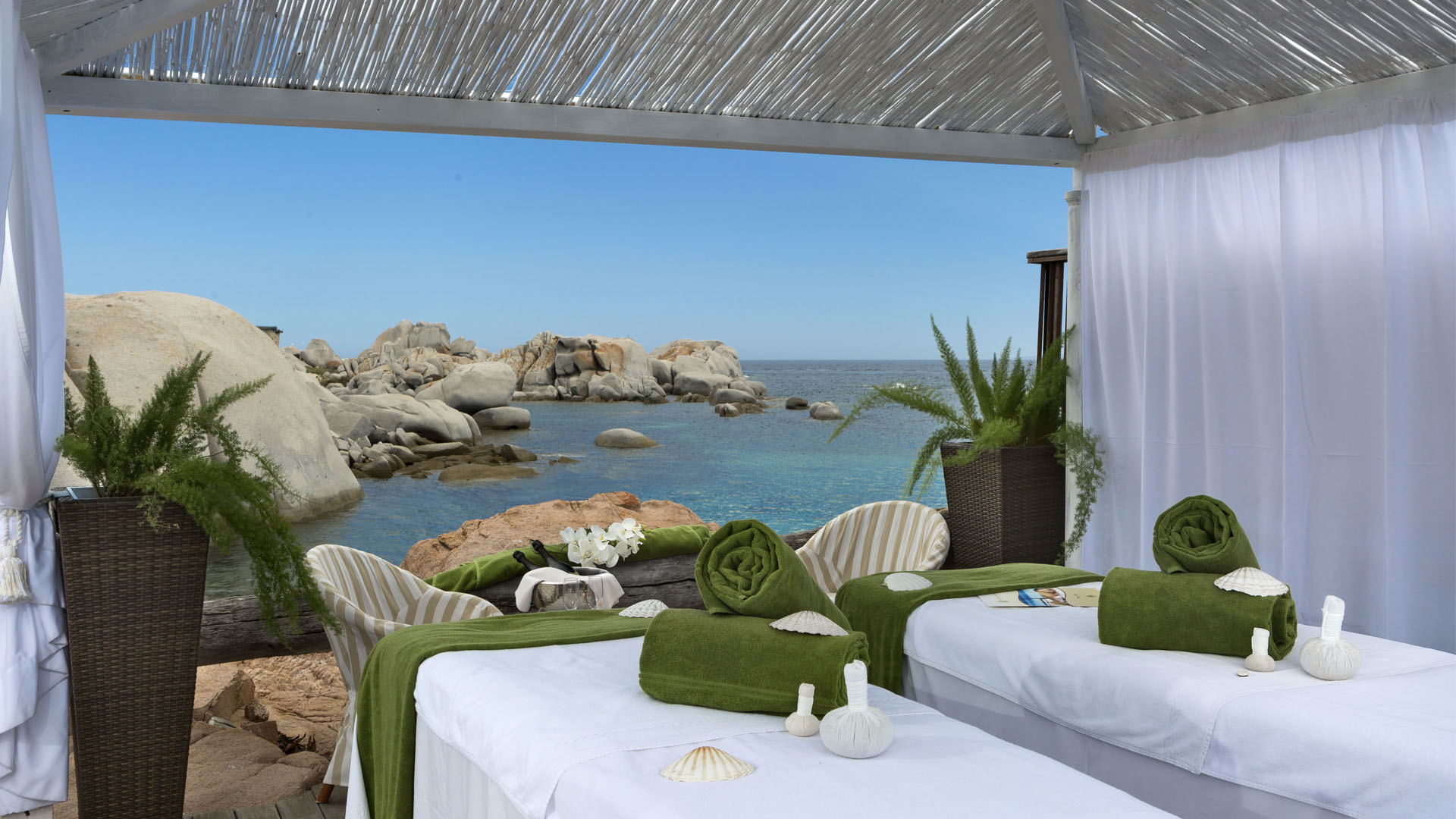 Hôtel & Spa des Pêcheurs is a luxurious, seasonal hotel near Cavallo’s southern tip. The hotel sits on Shore Club Beach, which is known for its calm, clear water. Its simple rooms were built around the huge grey rocks; some of them are interesting interior design features. Balconies and terraces overlook the turquoise sea. So does the spa—where there’s a small indoor pool in front of a huge picture window and an open-air treatment room, so you can listen to the waves—and the always quiet pool.