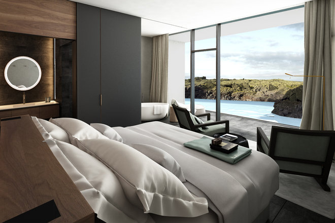 You’ll no longer have a good reason to avoid the Blue Lagoon starting this autumn, though. A luxury hotel, Moss Hotel & Lava Cove, is opening a private extension on its south shore. The hotel’s spa and library, restaurant and lounge all have views of the 800-year-old lava flows and the pool that started filling in around them in the 1970s. Some of the rooms overlook the moss-covered lava fields. Others offer direct access to the hot water. They all feature floor-to-ceiling windows, sleek Nordic design, and muted colors. The beds and cozy chairs face the lunar-like landscape. The free-standing bathtubs do, as well.