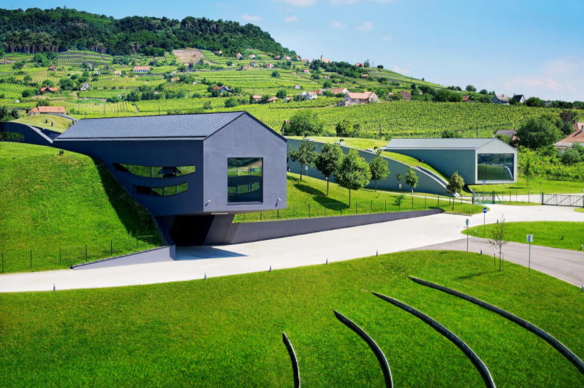 Kreinbacher Birtok is a relatively new winery. Though grapes have been grown on this land for centuries, the estate was only founded in 2002. But it quickly flourished. New, modern buildings were built into the surrounding landscape in 2011. They have an industrial vibe with lots of concrete. Traditional grapes—Jukfark and Furmint and Welshriesling—grow in the background. Plus their first sparkling wines were released in 2014.