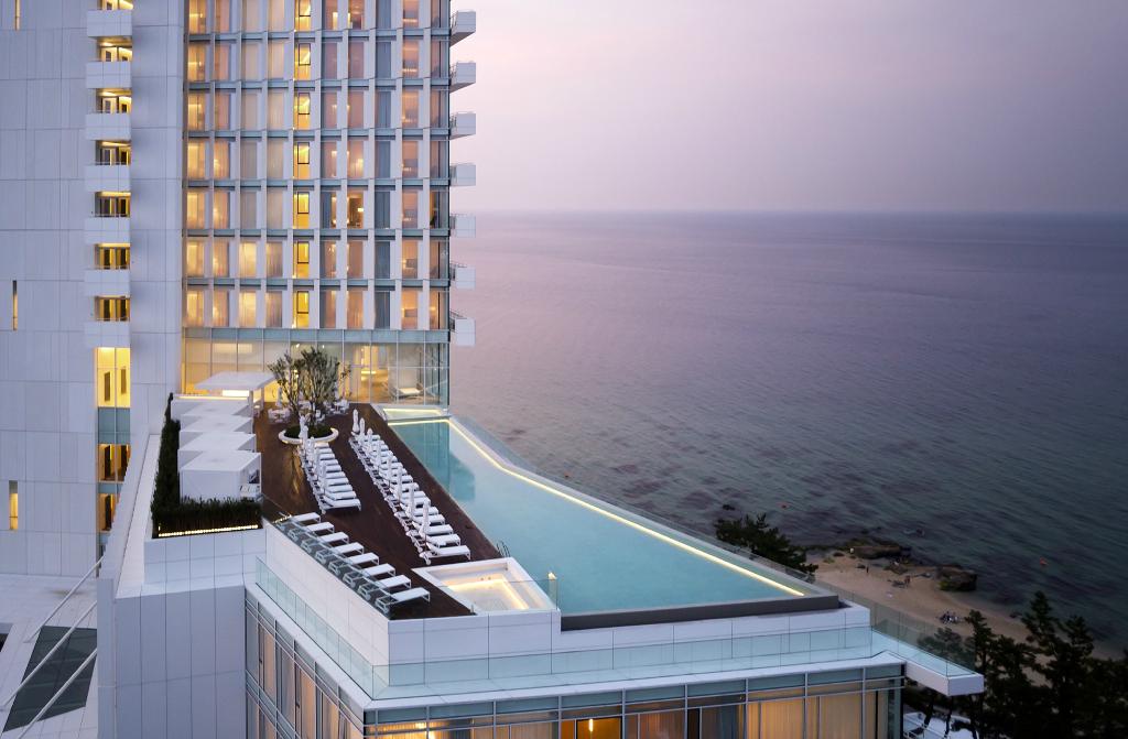 The hotel is immediately impressive. The two-story lobby features a 65-foot table cut from the trunk of a zelkova tree. You almost don’t notice the simple George Nakashima chairs and the wavy Ingo Maurer chandelier because of it. There’s a gallery with ancient Silla art, a huge granite fireplace in the Lounge, and the all-white Chef’s Table, as well. The zen basement spa offers everything from a red clay room to a scrubbing room. The Beach on the Cloud is an outdoor pool surrounded by sunbeds, a jacuzzi, and a snack bar. Wooden steps lead down to the Beach House and the soft sand. There’s even a stage, called the Arena, for outdoor performances.