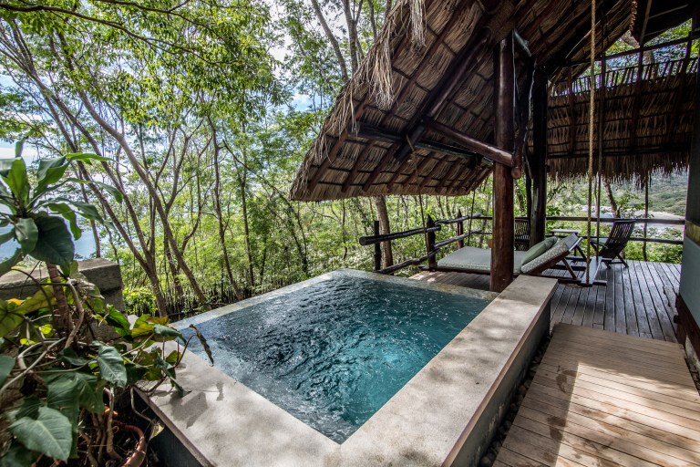 Your hillside bungalow is across the suspension bridge. It’s comfortable, rustic, and completely open to the elements. There’s a king-size bed and tropical hardwood floors inside. An iPod dock, a water purifier, and a beach bag make you feel right at home. Sliding walls open to a plunge pool, daybeds, and a swing that hangs from marine rope. A tree stump is now a side table. The thatched roof rustles with the sea breeze. While the view extends all the way across the beach.
