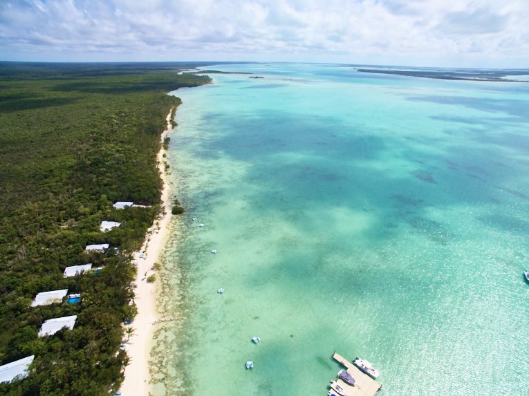 So it’s only fitting that you’re staying at an eco-friendly resort on this trip. Tiamo is surrounded by a 125-acre nature preserve on South Andros. It’s accessible only by boat. The resort is tucked in between dense palms and sea grape trees on the island’s northeast coast. If it weren’t for the dock and the boats bobbing beside it, it’d be difficult to find the property, as you return from your scuba-diving adventure. Even the glass kayaks are hard to spot.