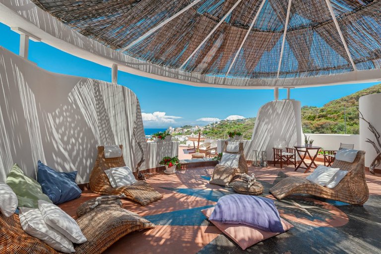 Hotel Chiaia Di Luna probably sits on the best spot on Ponza. The all-white hotel is built into the hillside. Its restaurant overflows onto a spacious terrace and is dotted with wicker loungers, canvas chairs, and oversized pillows. They all overlook the pool. There’s a bar, whose couches seem to hang over the cliff. Only the small rooms are in need of upgrades. But you won’t be spending much time in yours anyway.