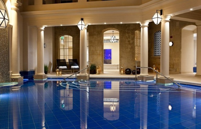You actually get to stay right at one of these spas. The new Gainsborough Bath Spa is the city’s only hotel with its own natural thermal spa on site. Two historic buildings, which were once a hospital, were redesigned into a hotel that opened two years ago. The Georgian and Victorian facades, as well as the limestone walls, remain. The spacious rooms now have soaring ceilings and tall windows, though. They overlook the spires of Bath Abbey. Calm colors (blues and grays), cozy fabrics, and printed headboards fill the bedrooms. Complimentary drinks and snacks are in the mini bar. There’s a small cocktail bar, an elegant lounge for afternoon tea, and a locally sourced restaurant downstairs, as well.