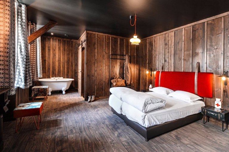 After disembarking from the train, you separate from the other passengers and make your way to Terminal Neige Refuge du Montenvers. The inside of the hotel still has wood floors and paneling. Much of the original furniture has been preserved. Miners’ lamps and leather trunks contribute to the hipster vibe. While retro basins and faucets have been added to the bathrooms. With an exposed bathtub, your Altitude Suite has a romantic vibe. It has an open dresser and a thick duvet on the bed, as well. But it’s still the view that demands your attention.