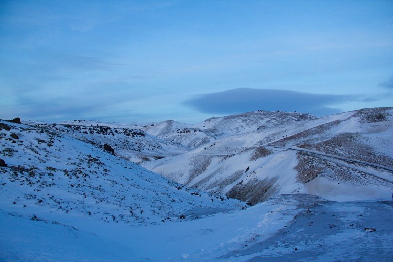 The road ends at the Hot River Cafe. Though the cafe is closed much of the year, there are usually cars in its parking lot, since it sits near the head of the Reykjadalur Hot Spring River Trail. At about 2.5 miles roundtrip, the first—and the most popular—section of the trail is short and, for the most part, wide. That doesn’t mean that it’s easy. The trail ascends from a steady incline to a steep slope. In front of you, steam spurts from small crevasses, holes are filled with bubbling mud, and “hætta” signs warn of dangerous areas. At one point, you have to choose between clinging to the side of an icy cliff or sliding down a steep hill on your butt. The steep hill wins. The whole time, the snow-covered valley, Hveragerði, and the fierce Atlantic Ocean are behind you. While the strong scent of sulfur is everywhere.