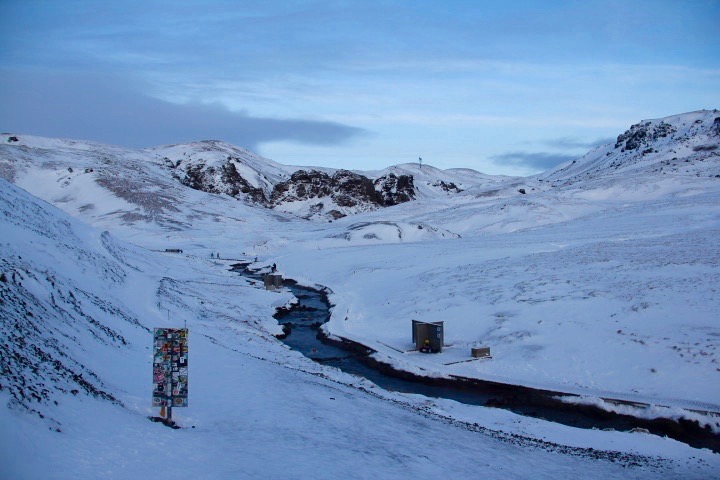 After about an hour of hiking, the trail descends into another valley. Wooden docks and semi-private changing stalls line the river in the middle of it. Modesty goes out the window with the wind chill. You pull off your winter boots and thick layers (but keep your hat) and quickly pull on your bathing suit, as your fingers start to feel numb. You slide across the icy boardwalk. Then you slip into the warm water. Though you’re surrounded by snow and ice, the cold has disappeared.