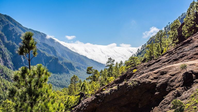 This breathtaking scene is on Los Brecitos. The hike started with a taxi ride of all things. The half-hour ride in a four-wheel-drive vehicle saved you from beginning the day with an incredibly steep hike and deposited you at a gorgeous viewpoint. The forest trail continued through Canary Island pine groves, near endangered Canary Island juniper, and around the Río Taburiente. You stopped to take photos of the Caldera de Taburiente more times than you can count. You took hairpin turns, saw Roque Idafe (a natural stone pillar), and detoured to Cascada Coloradas (a brightly colored waterfall). Then, as you veered back toward the parking lot, the clouds quickly rolled in.
