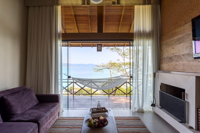 Ponta dos Ganchos sits on a private peninsula northeast of town. It overlooks a turquoise bay, three small islands, and a white-sand beach. Twenty-five free-standing bungalows are scattered among the rainforest-covered land. They’re made of wood and glass. They have wooden beams and walk-in closets, minimal decor and lots of light. Plus their spacious decks, strung with hammocks, have wide views of the water.