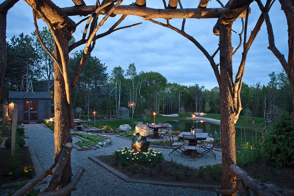 Tonight’s dinner certainly fits the bill. Earth’s setting, amidst a birch forest, is beautiful. Gravel paths weave between flower beds, herb gardens, and little wooden tables. Hurricane lanterns flicker atop the latter. Their light reflects off the still pond behind them. While laughter and clanking dishes tumble from the dining shed ahead. You step into the restaurant, constructed from cleared wood, to find cement floors, sturdy furniture, and potted plants. A stunning, preserved apple-tree chandelier hangs upside down overhead. The open space smells like a delicious mixture of seafood, garlic, and fresh-from-the-garden vegetables.