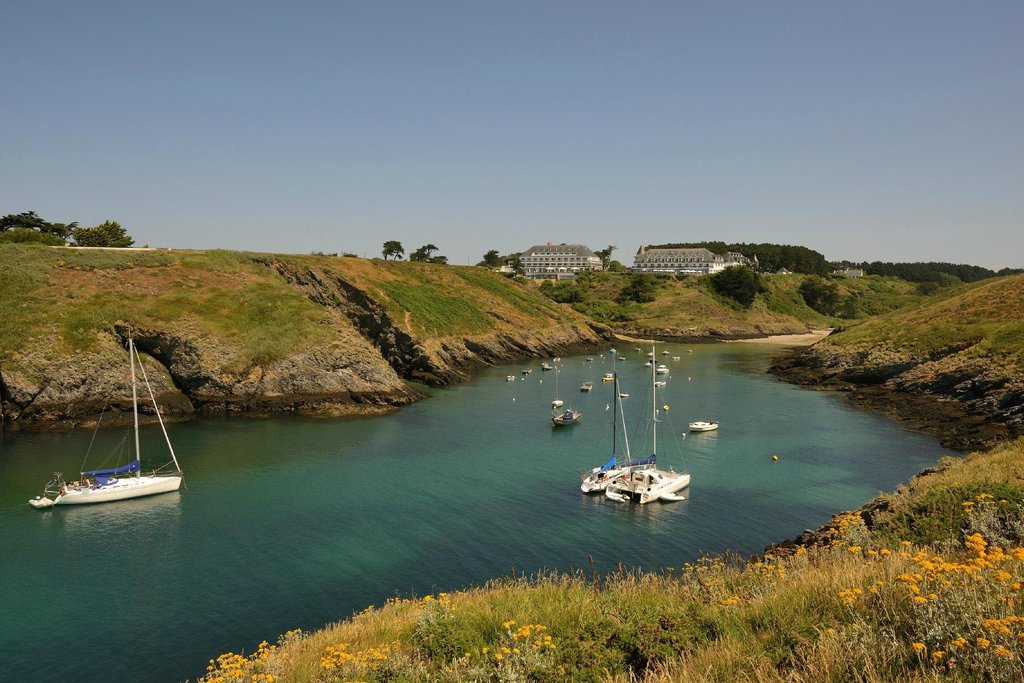 It’s impossible to miss the Vauban Citadel as the ferry approaches the main town of Le Palais. The waterfront fort is massive and star-shaped. Both Le Palais and Sauzon, farther up the coast, are pretty fishing villages with colorful houses. But you’re heading south to Bangor, a commune on the windy southwest coast. This is the location of the Goulphar Lighthouse, one of the most powerful lighthouses in Europe. It’s home to prehistoric menhirs, ancient burial grounds, and little chapels. It’s where Claude Monet, the founder of French Impressionism, painted the wild coast. It’s also where a grand hotel is perched above the cliffs.