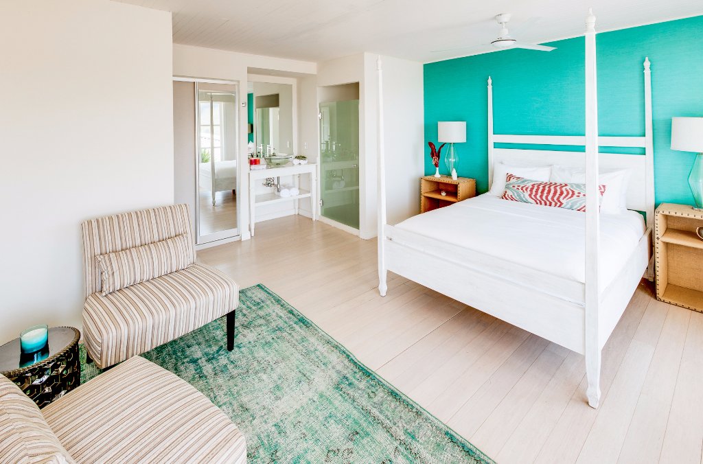 Then there’s Cacao. Your little retreat is whitewashed, save for one bright turquoise wall. It has a cozy sitting area and windows that let in lots of sunlight. Organic cotton bathrobes and slippers are in the bathroom. While the queen-size bed is topped with everything you need to sleep soundly. There’s no doubt you’ll be dreaming about an endless summer tonight.