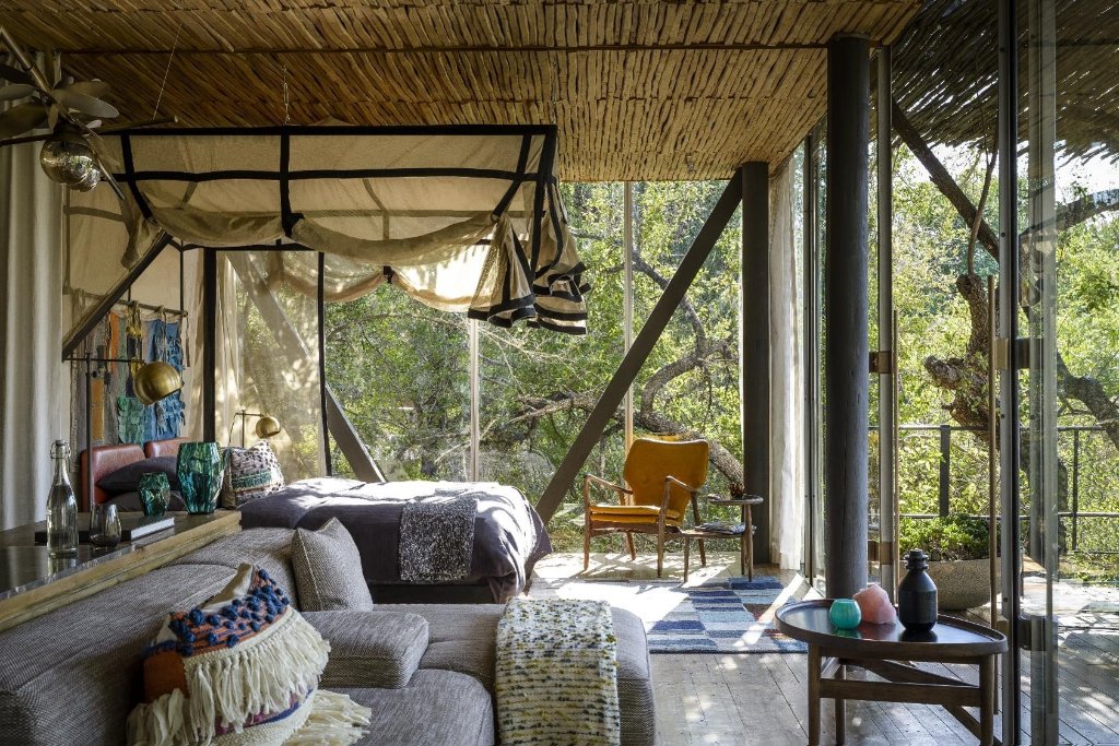 That would be Singita Sweni Lodge. Singita, which means Place of Miracles, is an eco-minded company that has grown from a single lodge to a dozen across three African countries. They opened Sweni Lodge in 2003. It’s part of a private, 33,000-acre concession in Kruger National Park, one of the largest national parks in the world. It lies at the edge of the Sweni River near the border of Mozambique. It’s perched high in the trees, thanks to wooden stilts. Plus, last year, its traditional safari decor was swapped for contemporary, design-forward pieces.