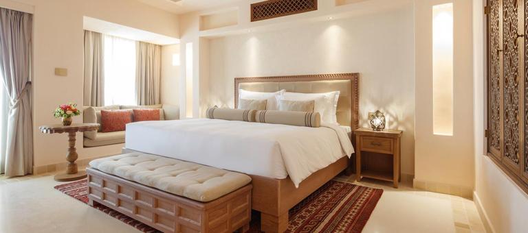 When the temperature rises to an oppressive level—something that always happens sooner than you expect—it’s time to head inside. Rooms, suites, and villas perfectly marry Arabian decor with modern design. Muted colors, soft fabrics, and light-filled window seats make the rooms feel cozy. There are hand-woven rugs below the king-size beds. Plus carved wall panels separate the bathrooms from the bedrooms.
