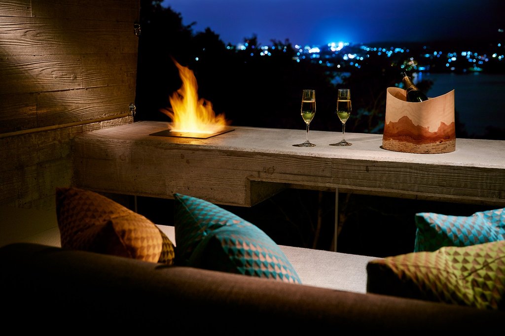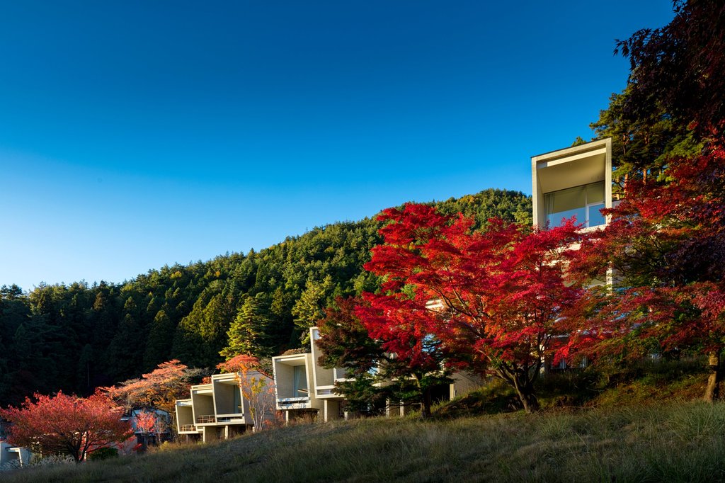 To feel even more connected to nature, you should stay somewhere that makes you feel like you’re living outdoors. It’s not camping. The Japanese don’t really do that. It’s not quite glamping either. That would still require a tent, albeit a souped-up one. This spot features cabins. But not the rustic ones that immediately come to mind. Instead, in true Japanese style, they’re minimalist cubes that jut out from the hillside. Three walls are concrete. The fourth is glass. It leads to a living room-style balcony outfitted with a wide sofa, colorful pillows, and a custom-built table that holds a fire pit. They all overlook the lake and, though the top is usually obscured by clouds, Mount Fuji.