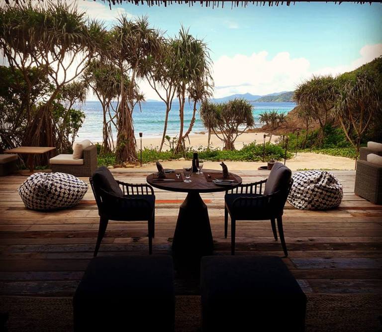 There’s a main pavilion sitting right above the beach. The open-air space, made with stone and lots of old boat wood, has high ceilings, cozy sitting areas, a wide deck, and an unobstructed view of the turquoise water. The dining room is here, too. Though its menu changes daily, it always features produce from the chef’s garden, off-the-boat seafood, and locally grown coffee.