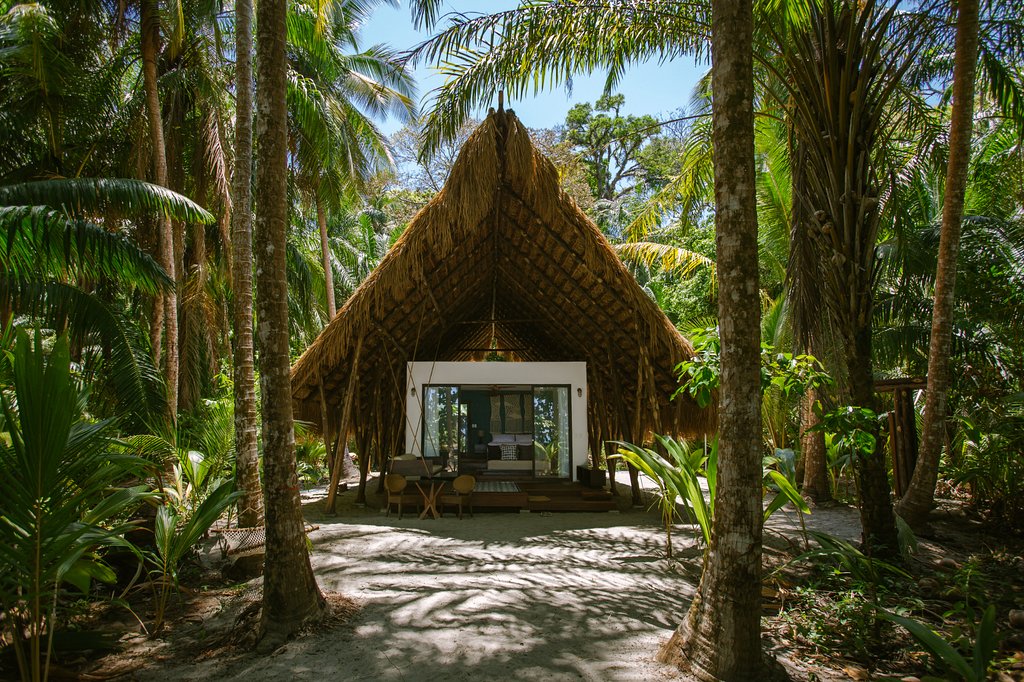 After arriving in Panama City, you fly another hour to David, transfer for 45 minutes to Boca Chica, and ride 15 minutes across emerald water. A cold cocktail awaits you in the thatched arrival pavilion. An electric GEM vehicle then drives you across the island to your hidden, thatched-roof casita. It’s adorable. A wooden deck is outfitted with a patterned rug and a swing couch. Sliding doors lead into the tiered bedroom. It has a single turquoise wall, a king-size bed, and double armoires. An open-air bathroom, with a bamboo rainfall shower surrounded by a garden, is also out back.
