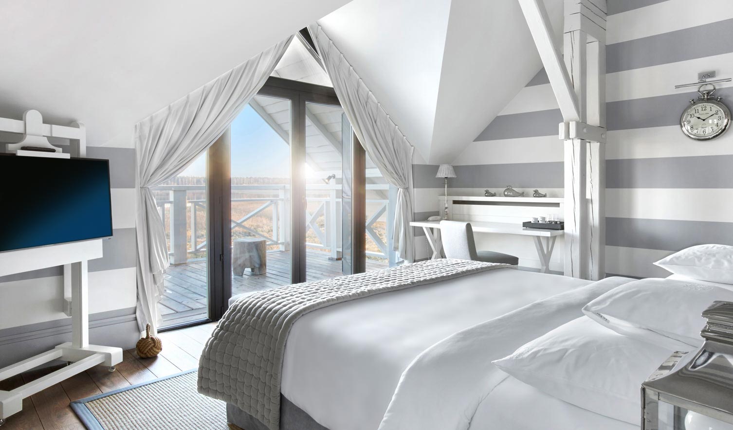 You’re in Suite 13 in one of the small houses. While some of the suites contain original furniture and historic character, this one is completely modern. A shared living room, with big windows and beachy furniture, is on the first floor. The upstairs bedroom features wooden floors, striped walls, and a little writing desk. The queen-size bed, topped with crisp white sheets, faces the balcony and the lake. You open the curtains and the French doors as soon as you wake up in the morning.