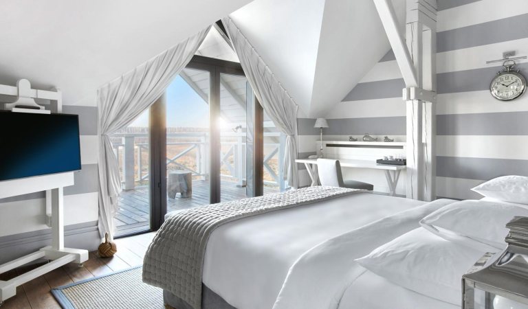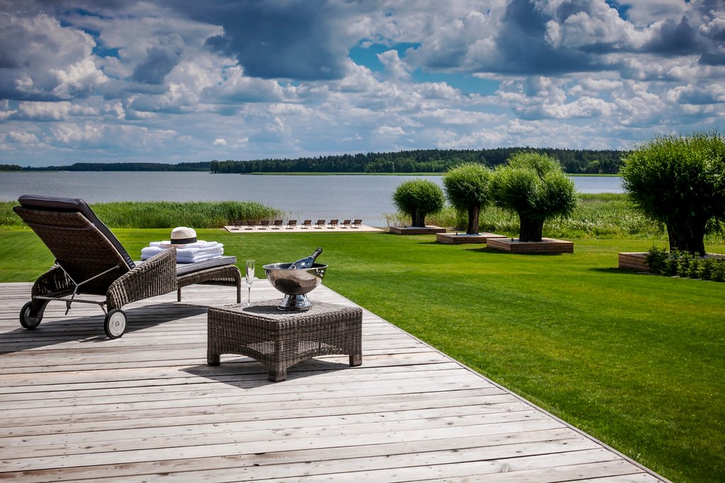 Masuria Arte Manor & Spa is a secluded retreat outside of Stacze, a small village that was part of East Prussia until the end of World War II. The manor house sits on 200 acres that include expansive lawns, tall-grass meadows, and dense forests. Its two main buildings contain the cozy reception area, the posh restaurant, and the holistic spa. Fourteen large suites are spread between their top floors and three smaller houses. A huge terrace is also dotted with plush chairs and couches. It has a view of the private beach and the peaceful lake.