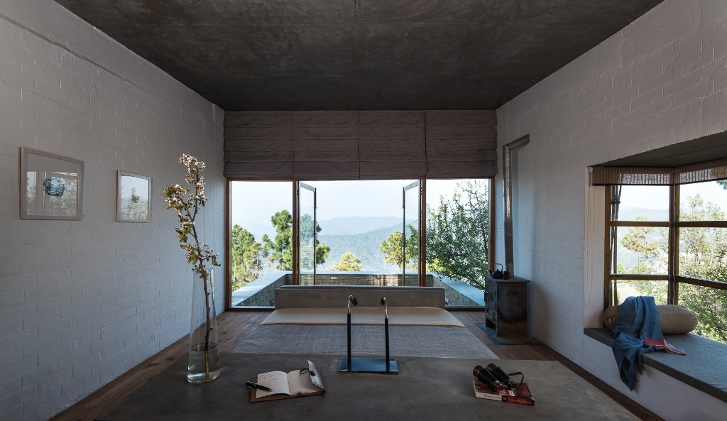 Ten suites are scattered among five buildings along the ridge. The freestanding buildings are made of stone and bamboo. Floor-to-ceiling windows, lined with blackout curtains, front each minimal suite. They have pinewood floors, bamboo beams, and wide window seats. Kettles sit atop log burners. Plus sleek bathrooms with huge walk-in showers feature natural Ayca products.
