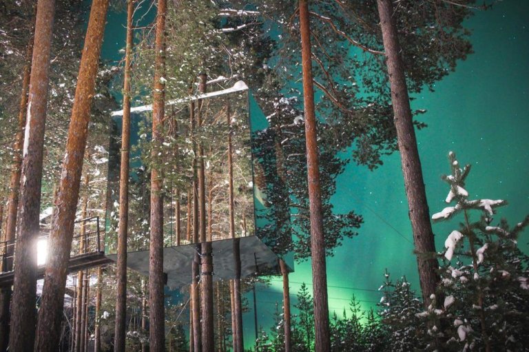 A bird’s nest that blends into the trees. A hanging cabin topped with a roof deck. A mirrorcube covered in reflective glass. A UFO with a collapsible ladder. These are some of your accommodation options at Sweden’s Treehotel.