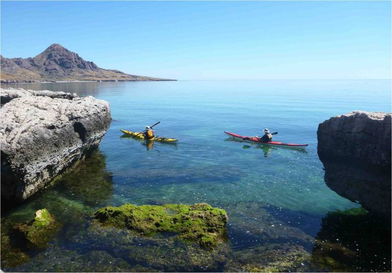 Loreto: Kayak through Mexico’s largest marine reserve, beaches, mangroves, rocky islets, turquoise water, massive rock formations, and pods of dolphins in Baja California.