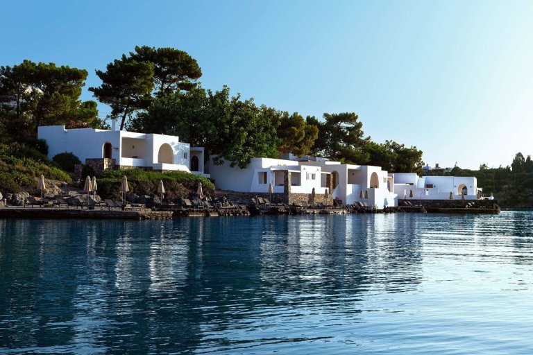 Your sights are set on Agios Nikolaos. The capital of Lasithi, Crete’s easternmost region, lies on Mirabello Bay’s western shore. It has everything you want in a small Greek city. Archaeological sites. A 13th-century church. A waterfront promenade. A beautiful lake. A fruit-and-vegetable market. Outdoor cafés. Lively nightlife. Long beaches. The only other thing you need is a chic hotel. Agios Nik has that covered, too.
