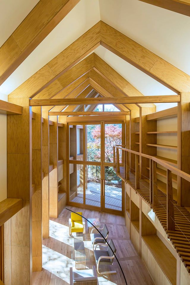 You could stand outside gazing at Shishi-Iwa House for hours. That’s how striking the building is. The interior and exterior spaces perfectly blend together, though. So it’s impossible to get a sense of the whole space without stepping inside. The reception area has a double-high ceiling and timber-framed glass doors that open into the garden. Blonde wood rises into a beamed peak. A library is tucked into the mezzanine. Sake and whiskey tastings are held among the books. The semi-circular Grand Room is the heart of the hotel. Breakfast is served at the large communal table by its fireplace each morning. All of the common areas overlook sun-filled terraces and currently blooming trees.