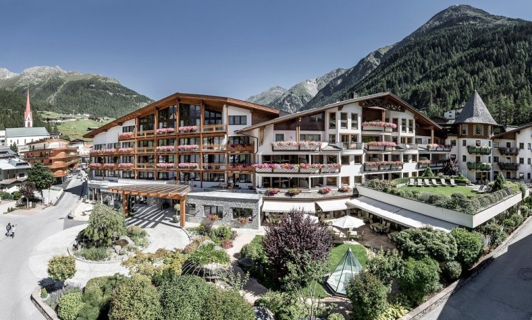 Despite its location in the middle of Sölden, Das Central feels like an alpine oasis. The chalet-style hotel sits along the Ötztaler Ache, one of the Inn’s largest tributaries. Bergbahnen Sölden’s ski lifts are just a short walk away. Once inside, you’ll find pure coziness with wooden furniture, large fireplaces, and traditionally dressed staff members. Rooms include soaking tubs, SuitePads (digital concierges), and Salomon hiking backpacks. Balcony boxes are overflowing with colorful flowers. Plus high peaks frame the view in every direction.