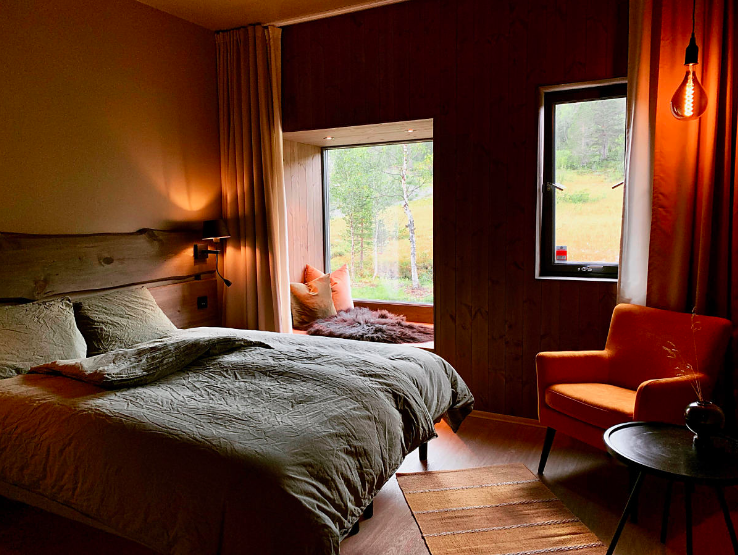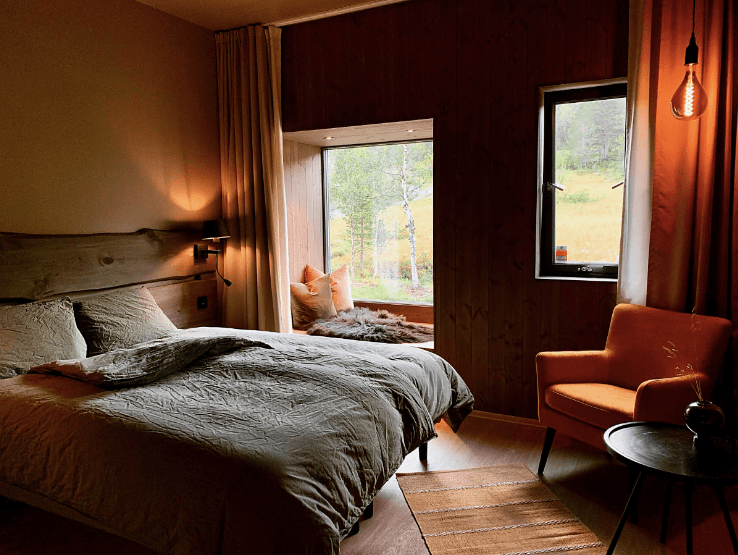 Bjørnfjell Mountain Lodge is the perfect place to relax—while continuing to soak up your gorgeous surroundings—after an adventure-filled day. The lodge is 20 minutes from the center of the city. It sits along the edge of SarvesAlta, an alpine resort with ski-to-door access in the winter and a climbing park, featuring 10 ziplines, the rest of the year. The lodge itself has a hygge vibe. The Old Norse word is usually associated with the Danes, though the Norwegians enjoy the cozy mood, as well. So expect lots of natural wood, soothing colors, and warm textures.