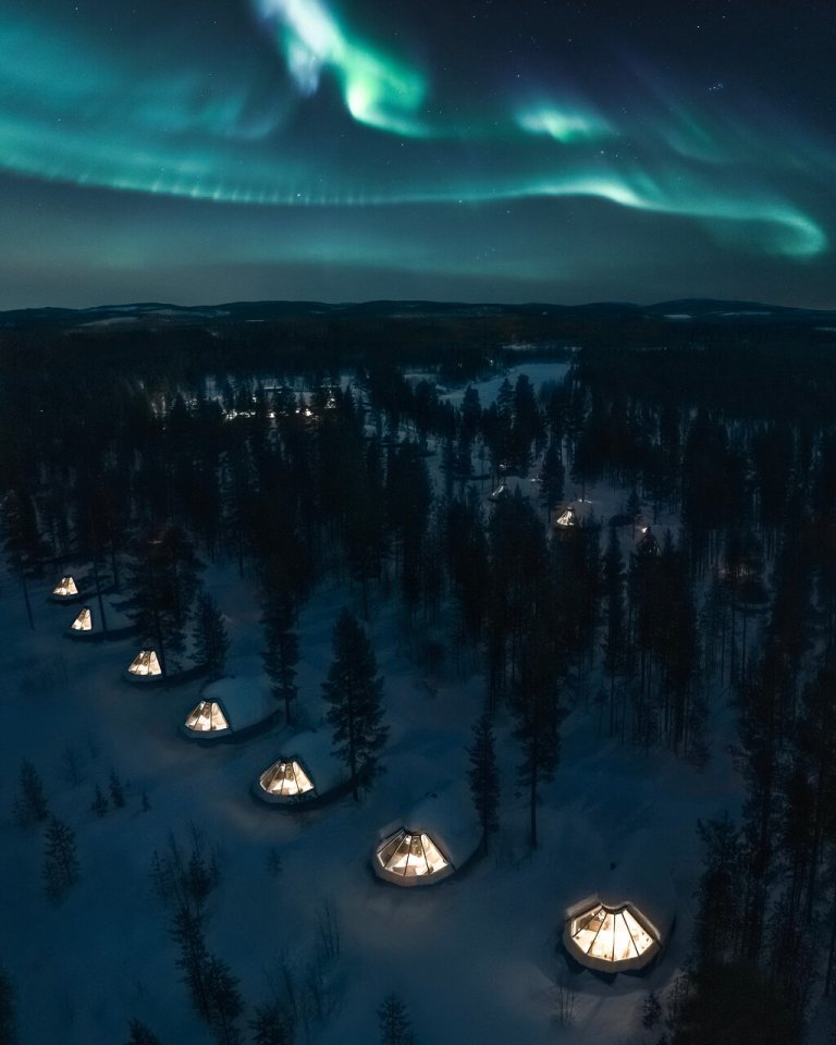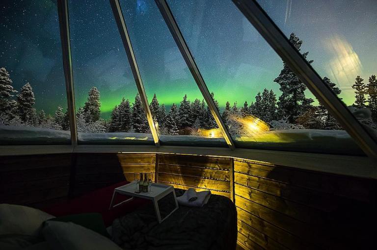 But you’re not. You’re in your cabin with absolutely no plans on leaving. Why would you? Your cabin looks like an igloo. It has a glass ceiling, whose panels are heated to ensure that ice and snow don’t obstruct the view. At the moment, that view includes droopy pine trees and a half-moon. Hopefully, if you wait long enough, the northern lights will make an appearance.