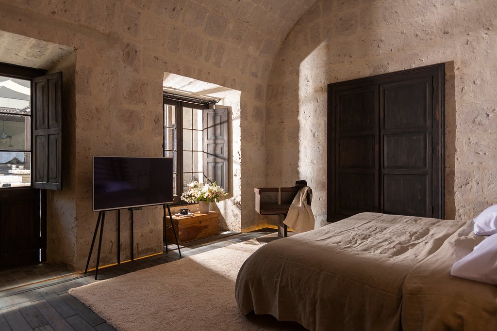 One of the 16th-century buildings, which used to be part of an ecclesiastical complex, in La Ciudad Blanca has been turned into a chic hotel. CIRQA’s exposed sillar walls and vaulted barrel ceilings remain untouched. They’ve been sectioned off into 11 rooms and a salon (a combined sitting room and dining area). The rooms are minimal and a bit moody with sturdy furniture and neutral decor. Smart TVs and wireless speakers keep things high-tech. Plus snacks and drinks are delivered in hampers. You select a Bóveda room solely for its freestanding bathtub.